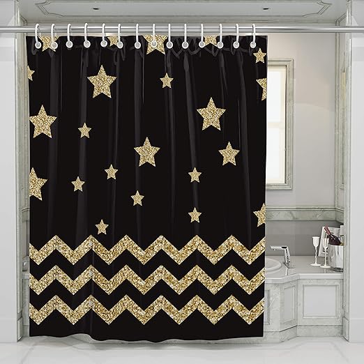 Gold Confetti On Black Waterproof Bathroom Decor Fabric Shower